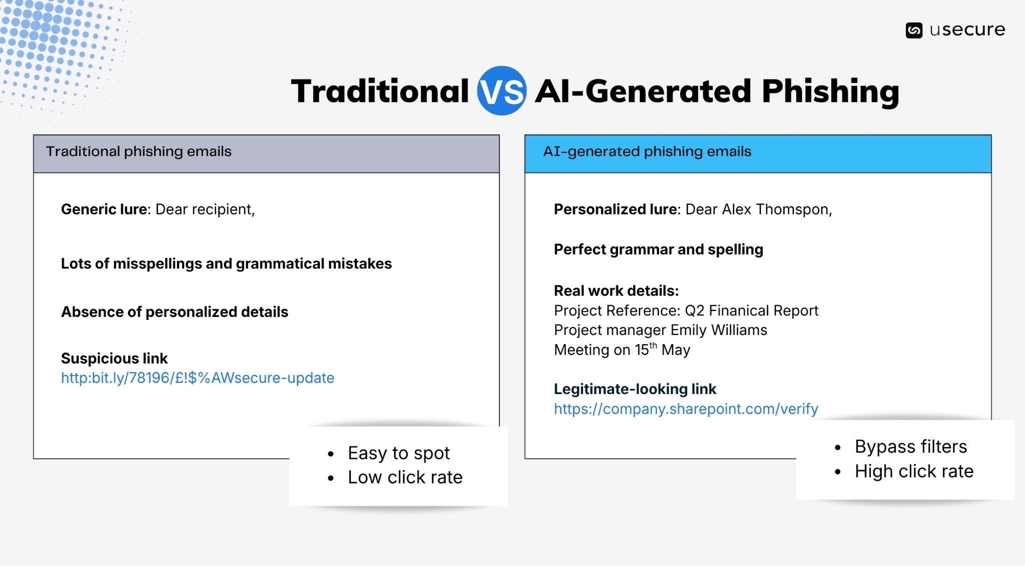 - The AI produces polymorphic emails, each one unique. It varies subject lines, greeting phrasing, sentence structure, tone, and even subtle formatting so that no two messages look identical. Traditional email security gateways rely on pattern matching, known malicious signatures, or statistical anomalies (odd grammar, repetitive phrasing, suspicious keywords). AI-generated emails contain none of those red flags: