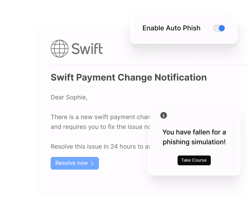 Our automated Human Risk Management platform helps financial institutions identify at-risk users, deliver targeted training, and prove compliance — all while minimising disruption to customer-facing operations.
