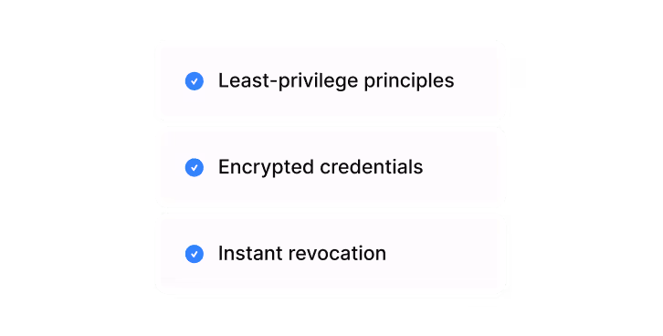 Integrations follow least-privilege principles, use encrypted credentials, and allow instant revocation.